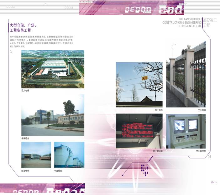 | 浙江湖州市建工集團(tuán)電子有限公司(前稱:湖州市劍宇安全防范工程有限公司)是經(jīng)省公安廳考核、發(fā)證的具有安防工程貳級(jí)設(shè)計(jì)、施工資質(zhì)的企業(yè)及國(guó)家建設(shè)部發(fā)證的弱電建筑智能化叁級(jí)資質(zhì),地處湖州市環(huán)城西路245-256號(hào),主要經(jīng)營(yíng)技防業(yè)務(wù),并參與智能化小區(qū)部分設(shè)施的設(shè)計(jì)、施工、承接安防、通訊網(wǎng)絡(luò)、背景音樂(lè)、綜合布線、樓宇對(duì)講、三表控制等工程。公司技術(shù)力量雄厚,中高級(jí)職稱技術(shù)人員占員工總數(shù)的75%。至今,公司已成功應(yīng)用了能體現(xiàn)國(guó)際國(guó)內(nèi)技術(shù)水平的“實(shí)時(shí)數(shù)碼監(jiān)控系統(tǒng)”、“指紋識(shí)別系統(tǒng)”、“遠(yuǎn)程云臺(tái)遙控系統(tǒng)”。 |