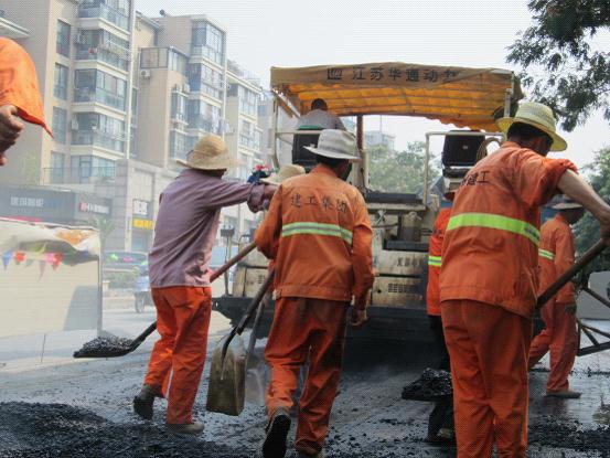 在熱浪滾滾的瀝青攤鋪現(xiàn)場,機(jī)器轟鳴,車流穿梭,運料、攤鋪、碾壓、檢測各工序正有條不紊地展開,F(xiàn)場的施工人員個個甩開膀子,揮汗大干,個個都是“包公”臉,渴了就喝一口提前準(zhǔn)備好的掛在攤鋪車上的茶水,累了就在路邊的行道樹下乘乘涼、抽支煙。