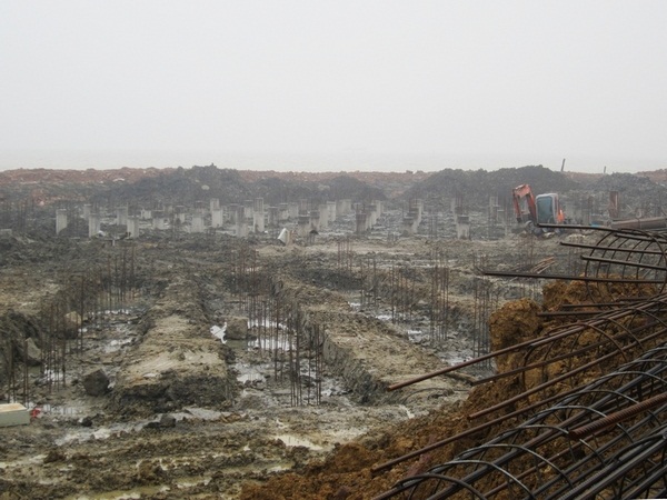 在一個細雨蒙蒙的日子,記者來到該項目部基地,看到基地大門口內砼攪拌站機器轟鳴,砼運輸車來往穿梭,工人正在扎鋼筋籠。