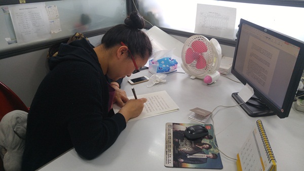 在造價部工作的大學生黨員戴麗琴在電腦前對著黨章邊抄邊說:“眼過千遍,不如手過一遍。無論是在大學讀書還是在企業(yè)工作,黨員都要用黨章規(guī)范自己的言行,才能起到模范帶頭作用!