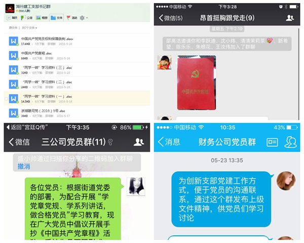 與此同時,集團公司各支部根據(jù)形勢的發(fā)展變化和各支部的實際情況,建立微信圈、QQ群,以手機網(wǎng)絡(luò)為支撐,打造“兩學一做”新平臺,開辟宣傳教育新渠道,創(chuàng)新思想政治工作新形式,為構(gòu)建企業(yè)和諧的政治生態(tài)奠定了基礎(chǔ)。作為建筑施工企業(yè),集團公司的黨員大多分散于各施工工地上,工學矛盾成為難以解決的問題。隨著信息技術(shù)的迅猛發(fā)展,以及手機上網(wǎng)、手機短信、微信、QQ群的廣泛使用,各支部終于找到了解決工學矛盾的“金鑰匙”:利用人人手機不離身之便,開設(shè)“掌上課堂”,開辟靈活機動的學習平臺,既簡便快捷又節(jié)省資源。比如集團公司黨委的支部書記群,在“兩學一做”活動開展后,把學習資料,自學自測試題等都搬到網(wǎng)上,支部書記們可以各取所需,黨員們能見縫插針擠時間閱讀學習,檢驗自己的學習成果,使政治學習“常態(tài)化”。一公司支部、財務(wù)公司支部、湖建裝飾公司支部、三公司支部等根據(jù)黨員年齡結(jié)構(gòu)年輕的特點,還都建立了黨員微信群,各支部書記是“班長”,把需要學習的內(nèi)容在群里分享,黨員可隨時隨地登陸學習,極大地解放了時間,方便了學習。