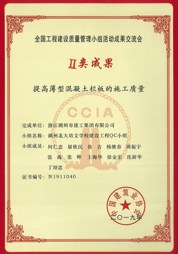 6月19日-7月12日,中國建筑業(yè)協(xié)會主辦的2019年全國工程建設質量管理小組活動成果交流會分別在大連、福州、呼和浩特、銀川隆重召開。參加此次交流會的有來自46個省市、行業(yè)協(xié)會推薦的1955項成果,經(jīng)專家組初審確認,822項成果作為發(fā)表成果進行大會現(xiàn)場交流,并最終評審出Ⅰ類、Ⅱ類、Ⅲ類成果。7月12日,由集團公司湖州北大培文學校建設工程QC小組報送的《提高薄型混凝土欄板的施工質量》課題榮獲全國工程建設質量管理小組活動成果交流會Ⅱ類成果獎項。
