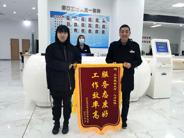 ■2月1日下午,集團(tuán)建筑工程公司書記趙一嫻一行至湖州市人力資源和社會(huì)保障局,向該局工傷保險(xiǎn)窗口贈(zèng)送了錦旗,以感謝該窗口辦事人員多年來熱情、高效地為集團(tuán)公司職工和施工現(xiàn)場(chǎng)農(nóng)民工工傷人員辦理業(yè)務(wù)!。ㄈ钫穹剑