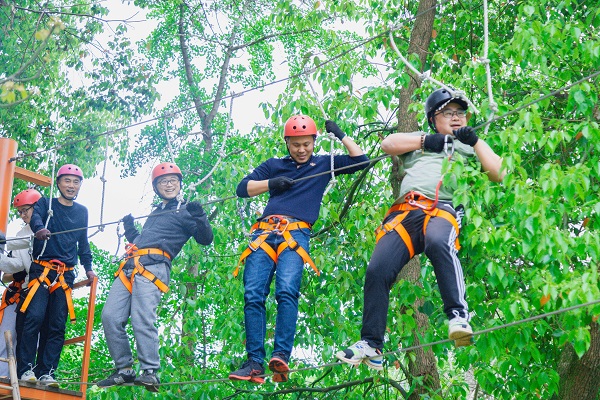 特別是在完成集懸空橋梁、網(wǎng)道、步道、索道和其他趣味環(huán)節(jié)一起的網(wǎng)陣穿越挑戰(zhàn)活動(dòng),都在高空中進(jìn)行,通過爬、滑、游、跳等動(dòng)作越過所有障礙,到達(dá)終點(diǎn),體驗(yàn)高空墜落和自由滑翔的快感,感受攀爬的樂趣;顒(dòng)驚險(xiǎn)又刺激,有幾位女同志恐高膽子小的,本身已經(jīng)有點(diǎn)打退堂鼓的樣子了,可那幾位膽大的男同胞,還故意在半道上搞點(diǎn)創(chuàng)意,嚇得她們?cè)诎肟罩型弁壑焙,真是驚喜連連。