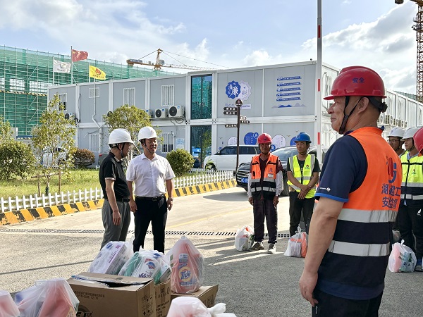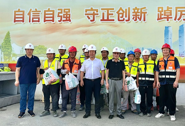 7月25日下午,市住建局黨委委員、二級(jí)調(diào)研員李湖濱,市住建局工會(huì)專職副主任何健等一行,在集團(tuán)公司董事長黃宏良的陪同下,來到我公司正在施工的湖州衛(wèi)藍(lán)建設(shè)開發(fā)有限公司康山北單元KS-01-02-13A號(hào)地塊建設(shè)項(xiàng)目現(xiàn)場,帶著防暑降溫用品慰問一線施工人員,叮囑施工人員高溫天氣施工要合理作息,注意防暑降溫。